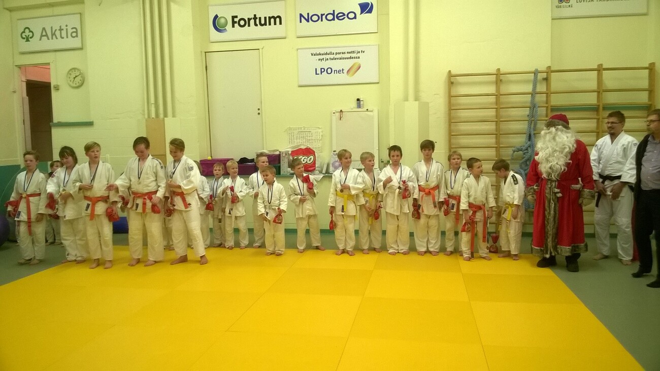 Syyskauden päättäjäisiä vietettiin 15.12. Ohjelmassa oli yhteistreenit, joulushiai ja uintia. Joulushiaihin osallistui 24 judokaa seuraavin tuloksin: Tulokset MUKSUT-1 (3) 1. ELINA RONKAINEN 2. VIIVI MULLI 3. LUCA VIRTANEN MUKSUT-2 (3) 1. AARON BJÖRKLUND 2. ANTTI NIEMELÄ 3. KEVIN MALMBERG MUKSUT-3 (4) 1. LINUS VISAVUORI 2. KONSTA VILJANEN 3. KONDRAD HOLMSTRÖM 3. RICO VIRTANEN MUKSUT-4 (3) 1. VÄINÖ MULLI 2. ONNI HONKANEN 3. WILL FINGERROOS NINJAT-1 (3) 1. MIRO VIRTANEN 2. TOPI HILTUNEN 3. LASSE DANSK NINJAT-2 (3) 1. LUCA MACKINTOSH 2. JESSE RONKAINEN 3. EETU NIEMI SAMURAIT-1 (3) 1. RASMUS LINDQVIST 2. AMELIE WALLÉN 3. EMIL RYTKÖNEN SAMURAIT-2 (2) 1. KONSTA TERÄVÄ 2. ROBIN LINDQVIST Linkki otteluihin täältä Joulupukki jakoi perinteiseen tapaan palkinnot ja joulupussit. Ilta päätettiin Palvelutalo Esplanadilla uinnilla, jonka jälkeen tarjolla oli joulutorttuja ja mehua. |